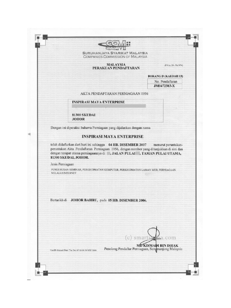 Ssm Certificate Pdf Borang D Kaedah 13 Perakuan Pendaftaran Akta Pendaftaran Perniagaan 1956 Dengan Ini Diperakui Bahawa Perniagaan Yang Dijalankan Course Hero